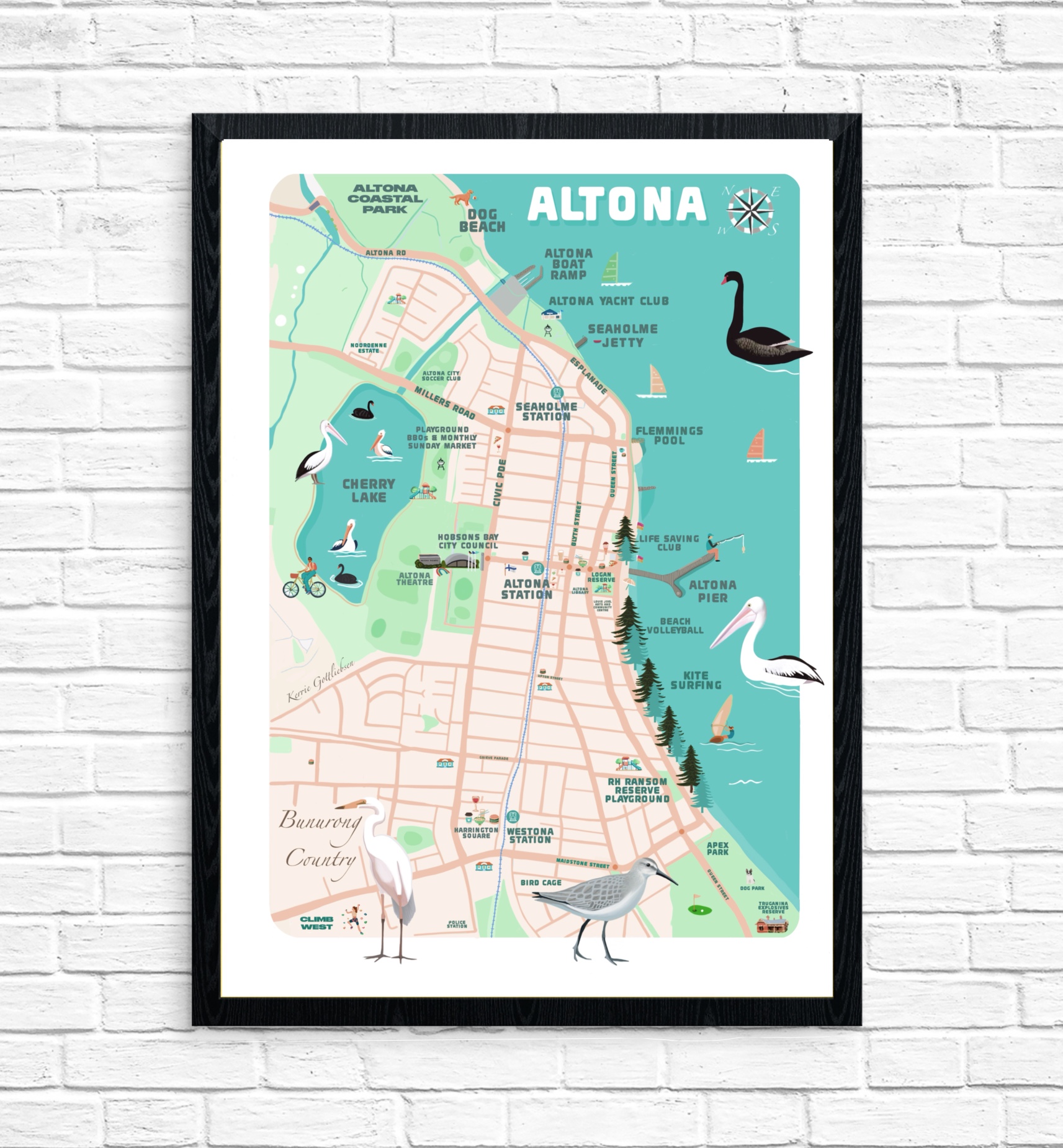 The Altona Map Teal poster artwork by Kerrie Gottliebsen celebrates the much loved area of Altona. The Map highlights iconic locations including Cherry Lake and the famous Altona Pier, all the way down to the Truganina Explosives Reserve homestead. Grab a copy and draw your house on the map, or contact Kerrie and she’ll customise your own poster for an additional $80.